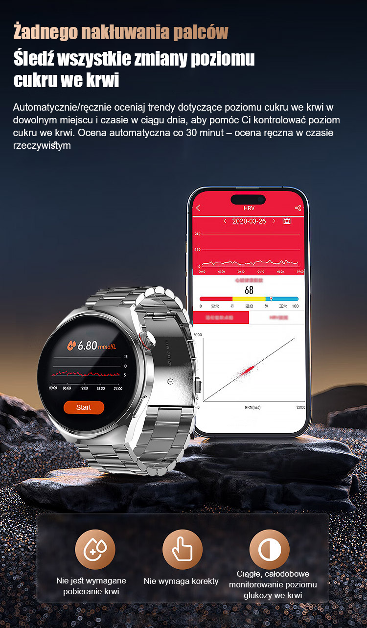 [Oficjalny produkt] ✅🥇 [Limit 20 sztuk] Zegarek do pomiaru poziomu glukozy we krwi, pasek stalowy